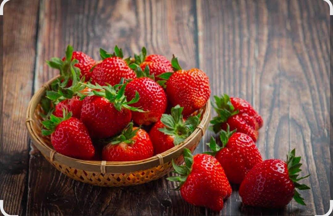 Strawbery: Buah kecil berwarna merah cerah dengan permukaan dipenuhi biji-biji kecil di bagian luar.
